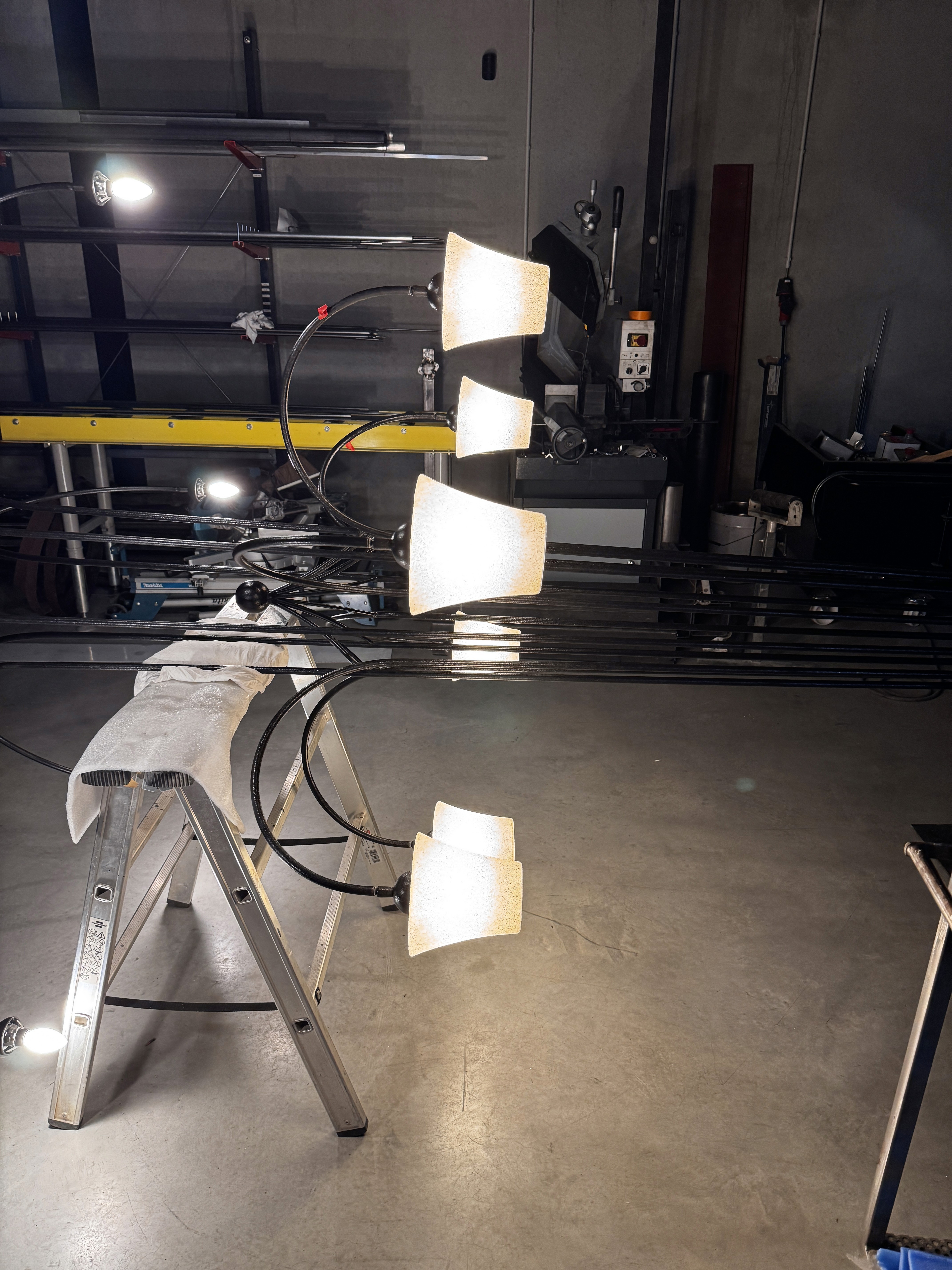 Onze volledige productie gebeurt in ons eigen atelier. Hier worden alle lichtobjecten met de hand gesneden, gevouwen, gepatineerd, gelast en bedraad volledig in-house en met oog voor luxe afwerking.